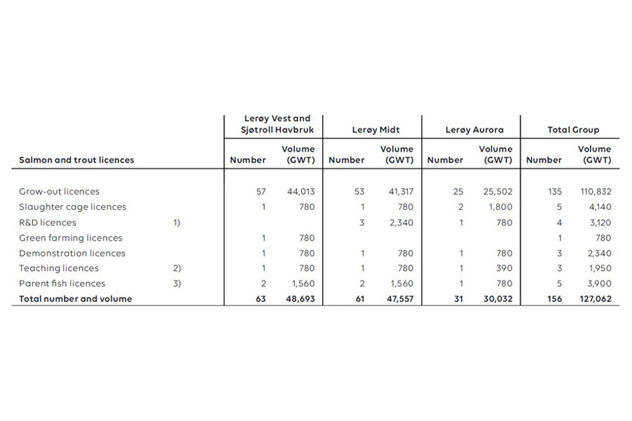 3) Broodstock fish licences allocated on Lerøy Aurora in the table above legally belongs to Lerøy Midt AS (group company), but is operated by Lerøy Aurora. For a more detailed explanation of why farming licences are deemed to have an indefinite useful life and are therefore not subject to amortisation, please see item (X) in the note on accounting policies.