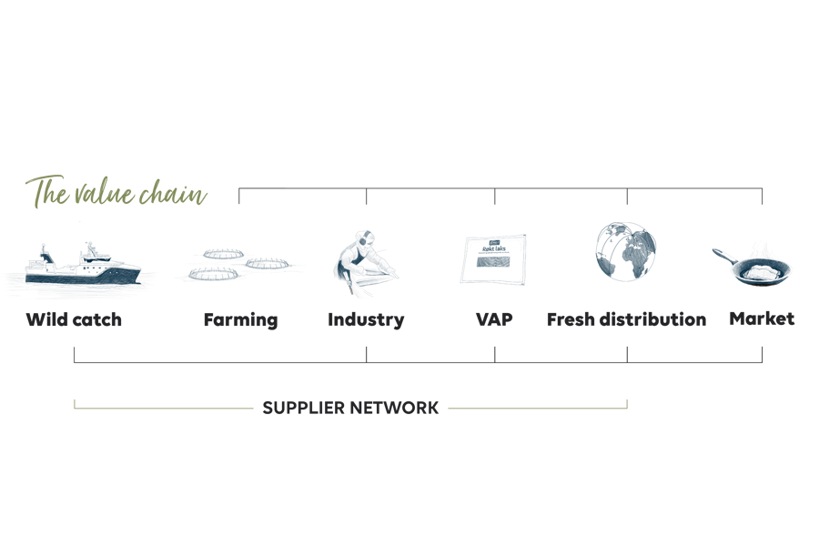 For Lerøy Seafood Group as a corporation, maintaining a constant focus on areas where we have the greatest influence in terms of sustainability is essential. Based on a critical evaluation of the value chain and our processes, we have concluded that we currently have the greatest influence within our work on the different areas related to our fish-farming activities. A major share of our efforts related to the environment and sustainability will therefore focus on fish farming.