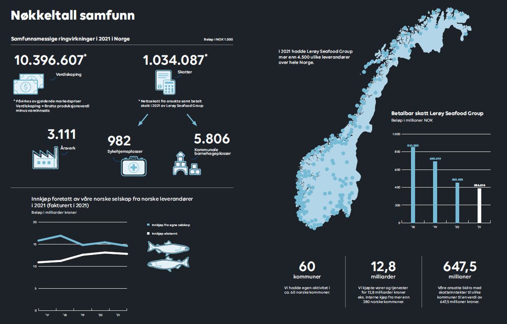 Gjennom våre desentraliserte lokasjoner bidrar vi også til investeringer i bygninger, infrastruktur, kaier, flytende kaier og moderne utstyr i små lokalsamfunn. Disse danner grunnlaget for lokal handel. Faktisk representerer vi 25-80% av det økonomiske grunnlaget for visse leverandører i kommunene vi har fasiliteter i.