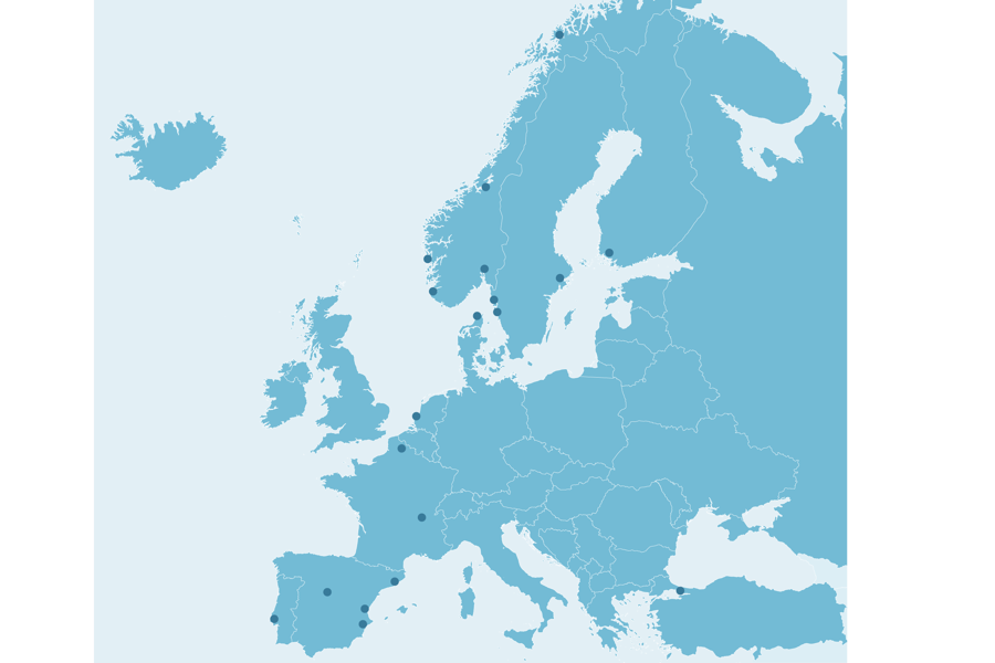 Kartet viser hvor vi har nedstrømsaktiviteter/distribusjonssentre for sjømat (i sentrale sjømatmarkeder).
