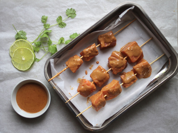 - Grillspyd med laks og sataysaus kan enten serveres alene som en etter trening-snack, eller sammen med fullkornsris eller nudler som en fullverdig middag. Du kan selvsagt også legge til grønnsaker, for eksempel edamamebønner, bakt paprika, grillet mais eller en grønn salat.
