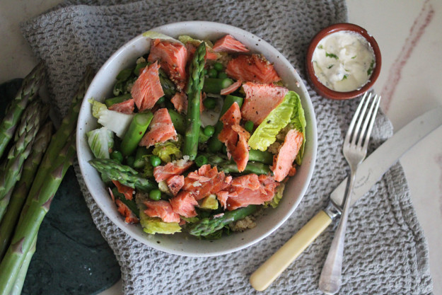 2. Salatskåler er vidunderlig, vet du hvorfor? Fordi alle kan forsyne seg selv med det de liker best, alle blir fornøyd og det er bare velstand. Ovnsbakt ørret med quinoa (eller fullkornsris) og pepperrotkrem – ja, takk.