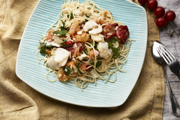 - Er barna veldig glad i spagetti, er denne retten med torsk helt prefekt. Med smaker av olivenolje og soltørkede tomater oser denne oppskriften av Italia.