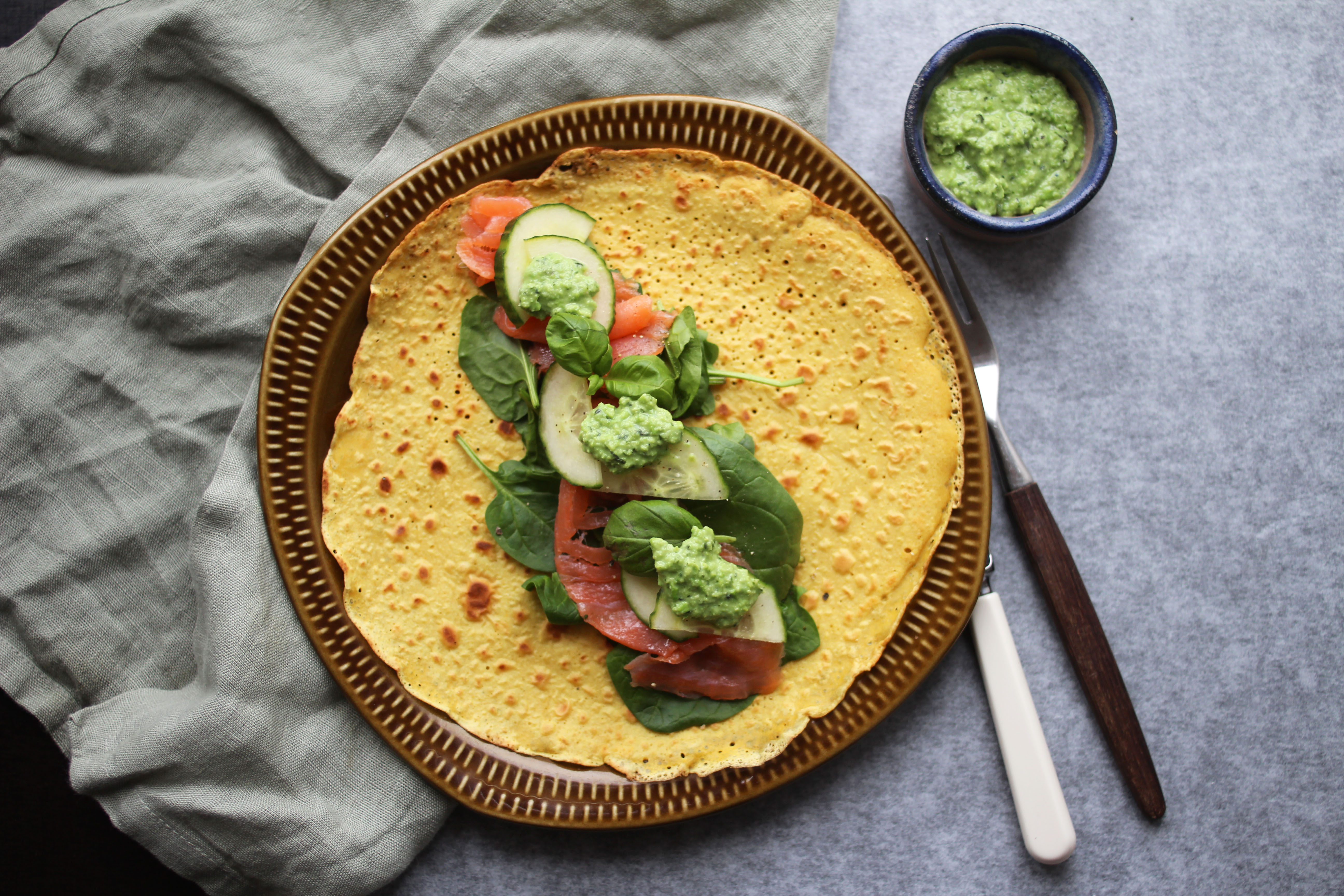 – Denne retten med kikertpannekaker kan være et utgangspunkt for så mye forskjellig, og kan spises til frokost, lunsj, middag eller som del av et tapasbord. Ønsker du å variere den kan du droppe agurken, smøre på litt kremost sammen med den grønne sausen, rulle den sammen og varme pannekaken litt i stekepannen med laksen inni – nam!