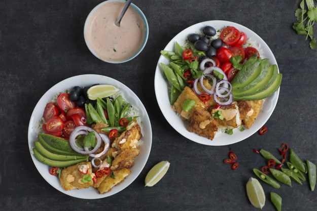 1. Burritoskåler med panert fisk, koriander og ris er en veldig enkel, men latterlig god rett utviklet av matblogger Aicha Bouhlou bak matbloggen Aichasmat.no. Hun er 55 år, født i Marokko og oppvokst i Tyskland. Likevel har hun bodd mesteparten av sitt liv i Bergen. Ved siden av bloggen skriver hun kokebøker og lager oppskrifter. Om den utvalgte retten sier hun dette: