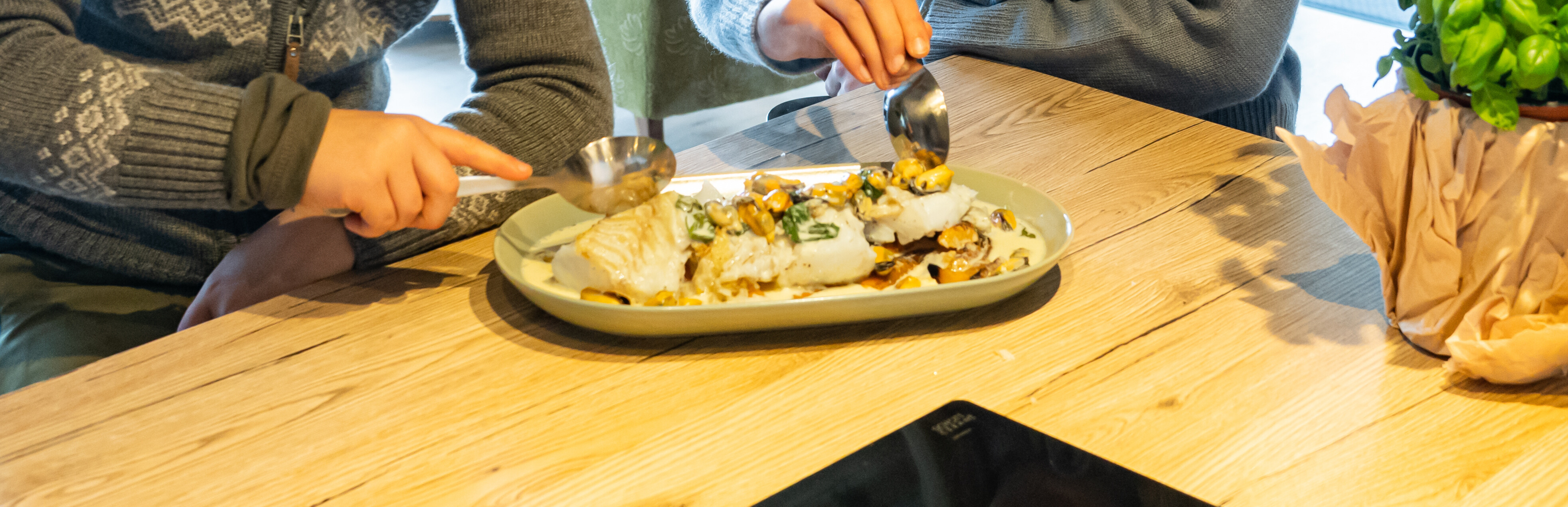 Rykende varm panne med torsk i kremet multesaus