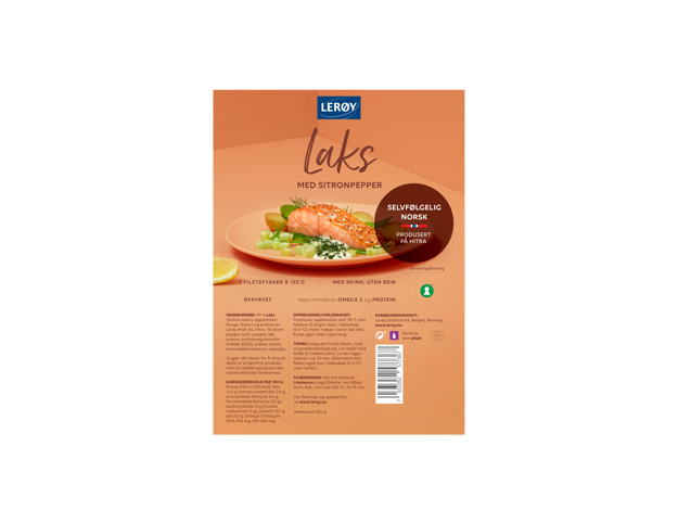 99 % laks (Salmo salar), oppdrettet i Norge, filetert og pakket av Lerøy Midt AS, Hitra. 1 % sitronpepper (salt, pepper, løk, aroma, surhetsregulerende middel (E330), sukker, tørket sitronkonsentrat, rapsolje).