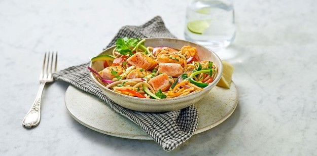 Dilimler halinde kesilen kırmızı soğan ve ince kıyılmış sarımsak, sıvı yağ eklenmiş bir tavada kavrulur. Jülyen halinde kesilen kabak, havuç ve kırmızı biber de eklenerek somonlar tavada kızartılır.
